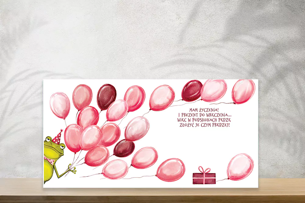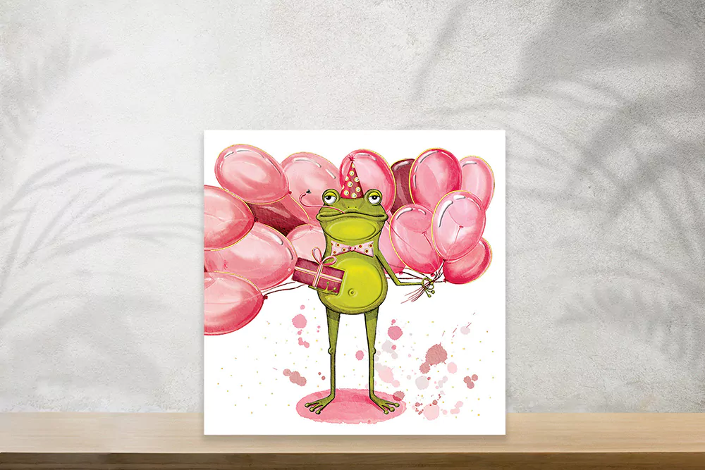 Karnet KW ŻABA wydrukowany na wysokiej jakości papierze formatu 15x15cm. Karnet uszlachetniony złotą folią. W zestawie kolorowa koperta.